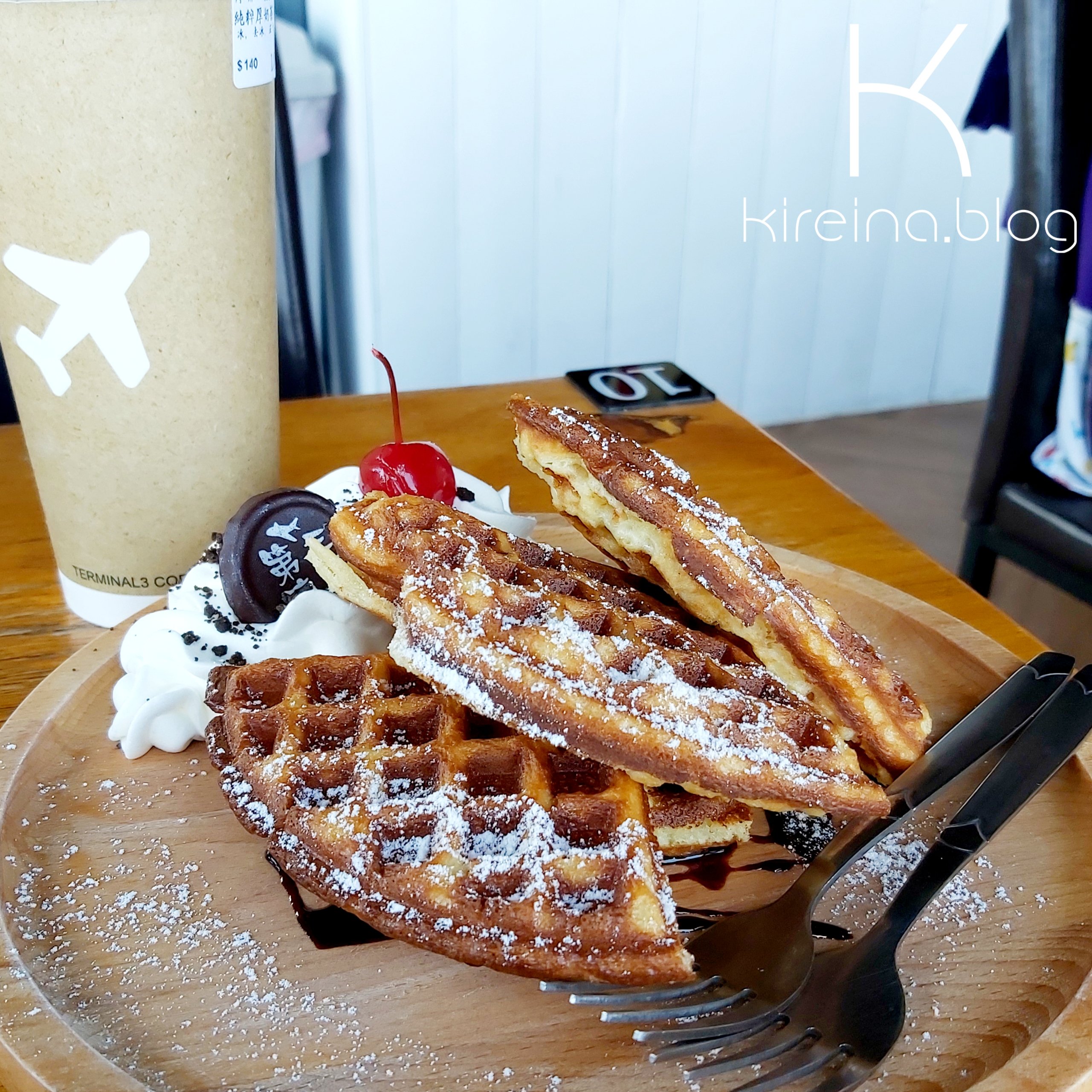 鬆餅是小YU跟小小YU的最愛,一上桌總是能夠吃個不停。我們點的是【奶油巧克力鬆餅 $140】,是小格子較薄的鬆餅,整體來說口感是比較軟的那種。巧克力沒有直接淋在鬆餅上,而是先淋在木盤底,再放上鬆餅,這樣的好處就是不會一次吃進太多巧克力醬,而是想吃多一點再沾一下。鮮奶油上面有放一片特製圓形巧克力,上面有印著「第三航廈」的字樣,讓拍起照來更有紀念性。