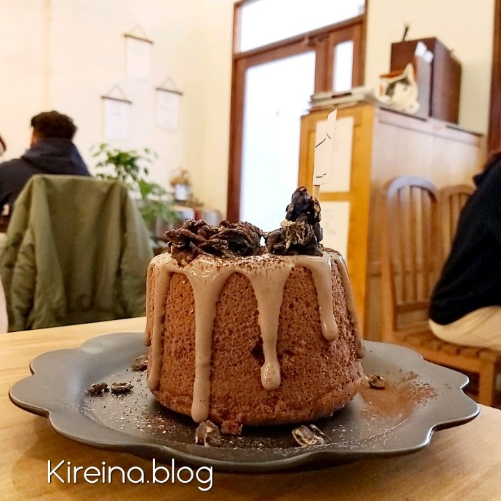 最後以想以蛋糕結尾,特別點了巧克力戚風$150,剛端上桌時,有質感的盤子,再加上巧克力脆片及巧克力鮮奶油的裝飾,讓人心情超好的。
