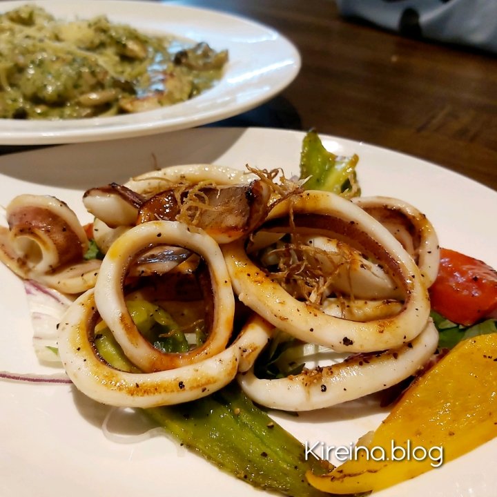 橄欖油彩椒香煎中卷 $180。這道是前菜,所以份量上看起來比較少。黑胡椒蒜香很合味,中卷煎的恰到好處,軟嫩好入口。我們是搭配B套餐點的。B套餐是任意餐點加$150元,可享一份前菜及$50飲料一杯。