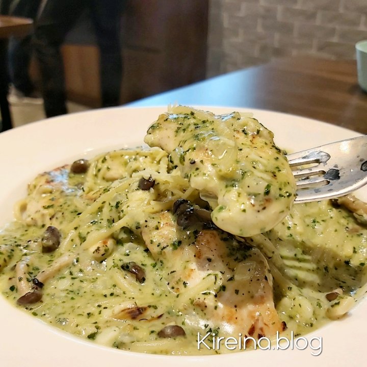 青醬野菇雞柳義大利麵 $240。義大利麵條很不錯,有咬勁。滿滿的野菇,雞柳嫩且多汁,不會乾柴。青醬風味還不錯,認真要說可以改進的地方,可能就是再加點堅果核果一起打會更香更好吃。