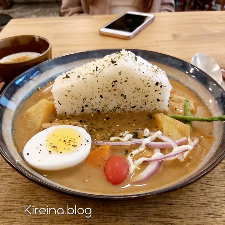 雞肉吃的出來有特別醃過跟煎過之後,才跟著咖哩一起煮,雞肉很嫩而且有肉汁。咖哩是有蔬菜甜感的日式和風咖哩,跟雞肉搭配起來,很match。